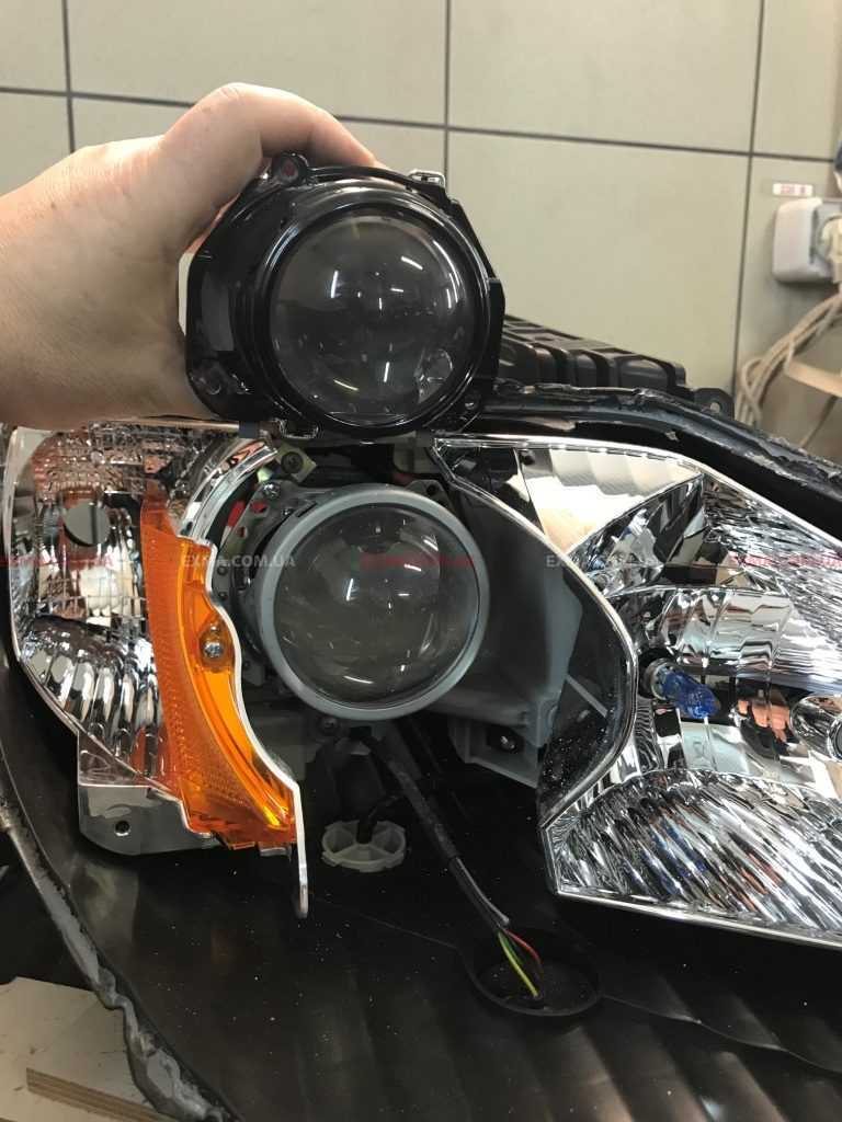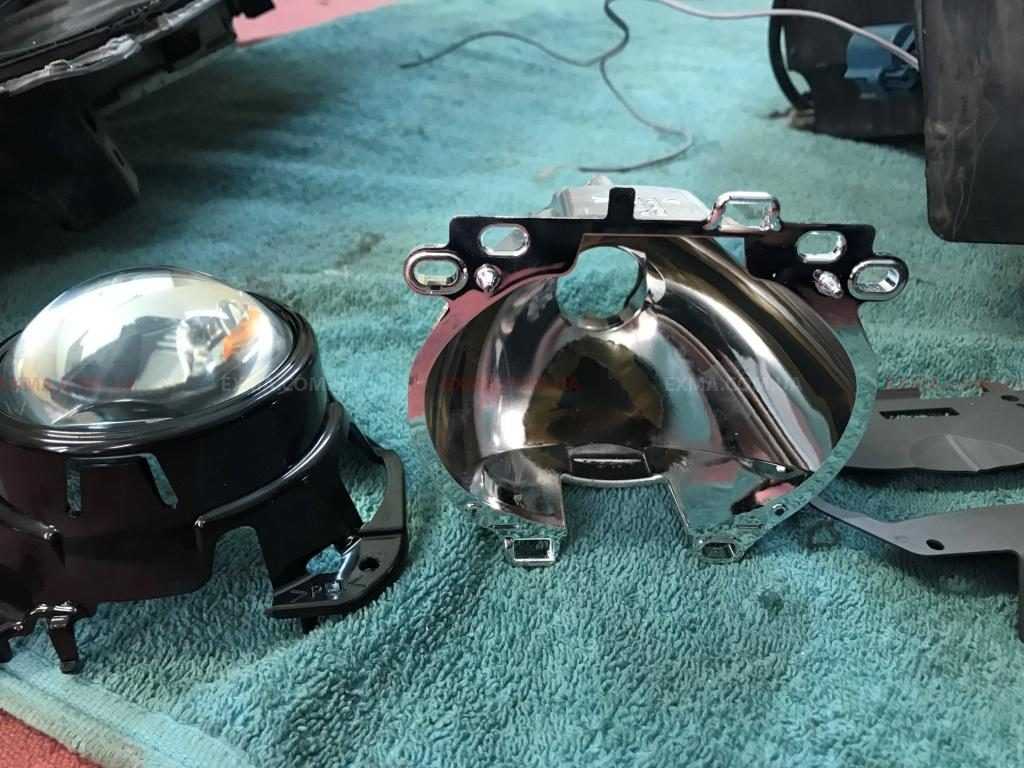 Решения два: замена фары или замена линзы. Второй вариант, понятно, существенно дешевле. На фото видно как выгорел отражатель уставшей линзы. Зачастую, у разных производителей, крепежные отверстия у линз не совпадают и приходится использовать специальные переходные рамки, чтобы новая линза стала в нужное место.